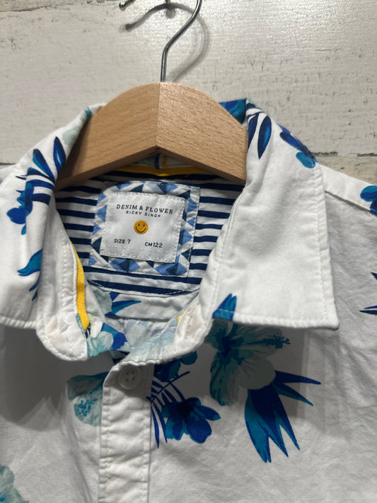 Boys Size 7 Denim & Flower Button Up Shirt - Very Good Used Condition