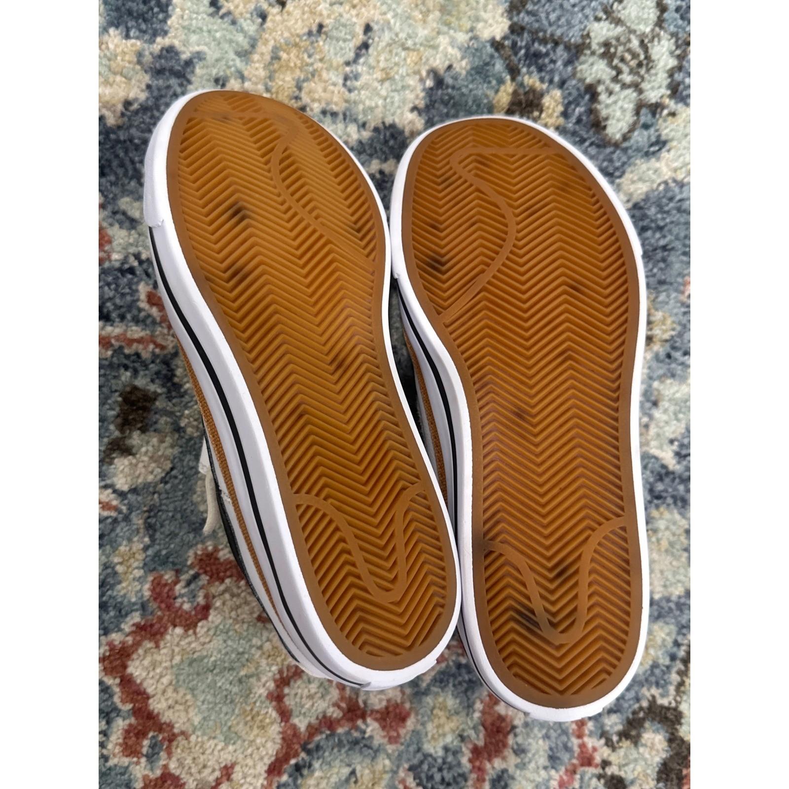 Nike Court Legacy low-top sneakers in a classic white and black colorway with a unique brown canvas piping detail. These kicks feature a convenient hook-and-loop strap over elastic laces for an easy fit. The durable rubber sole with herringbone traction makes them perfect for school or the playground. Retro tennis vibes meet modern comfort for everyday wear.